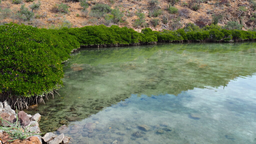 Einfahrt zur BUCHT CHENQUE kurz vor LORETO mit ihren Mangroven. Im Hintergrund das Gebirge SIERRA de la GIGANTA