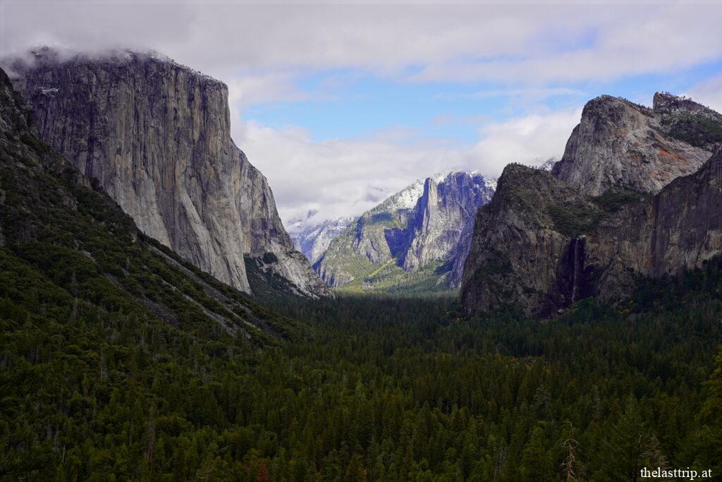 Blick hinein ins YOSEMITE-YALLEY. Der AL CAPITAN mit 2300m ist schon angeschneit. Schade, somit ist der TIOGAPASS mit 3031m in der SIERRA NEVADA schon gesperrt und wir müssen nun einen großen Umweg zum MONO-LAKE machen der auf der anderen Seite des Gebirgszuges liegt
