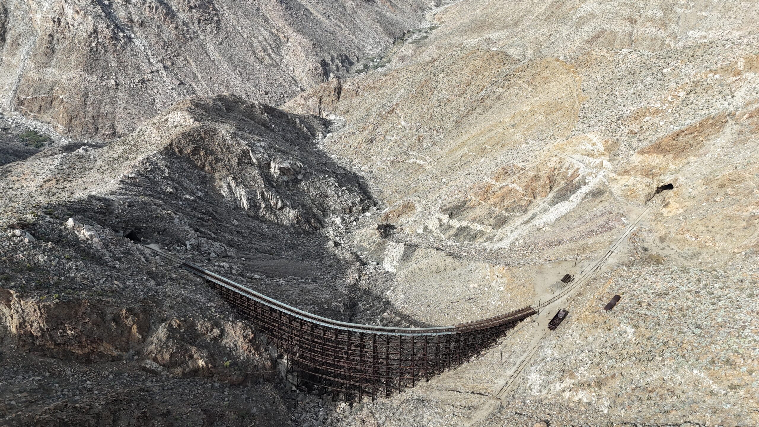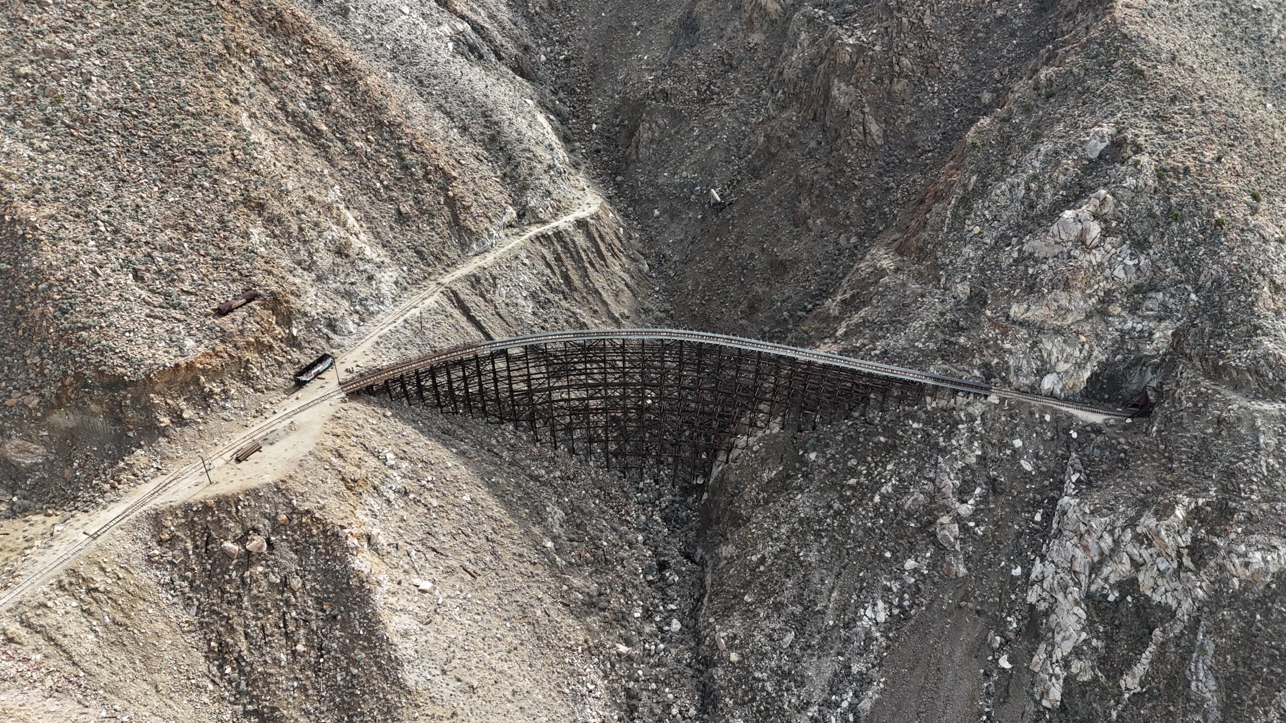 die größte Holzbrücke der Welt finden wir auf der unmöglichen Eisenbahnstrecke wie sie genannt wurde. Fertiggestellt 1919 verband sie San Diego-(Kalifornien) mit Yuma-(Arizona)